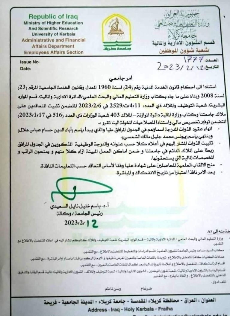 تبارك أكاديمية سيسكو المحلية عضو اكاديمية السيسكو (ست اسراء وهاب ) تثبيتها ضمن الملاك الدائم لجامعة كربلاء علما بان لها الدور البارز في قسم الاعلام للأكاديمية و لما تقدمة من اعمال جليلة بحق الأكاديمية